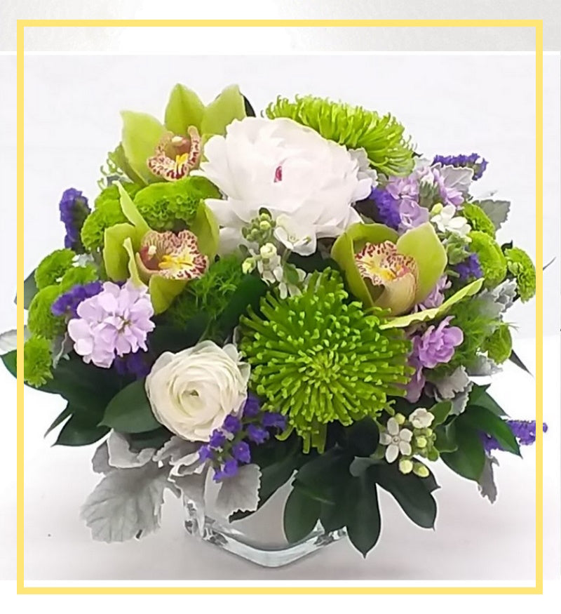 Filled with green Spider Mums, creamy white Buttercup (Ranunculus), green Boat Orchids (Cymbidium Orchids), green Button Mums, white Peonies, white Tweedia (Oxypetalum Coeruleum), purple Statice, pink Stocks, Dusty Miller, and Ruscus leaves.