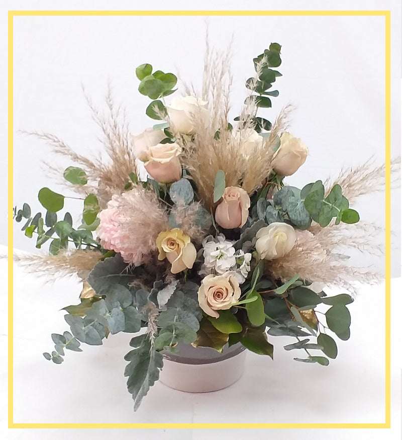 Featuring beige Pampas Grass, beige and white Roses, Baby Eucalyptus, Silver Dollar Eucalyptus, white Stocks, and golden Salal leaves (Gaultheria Shallon).