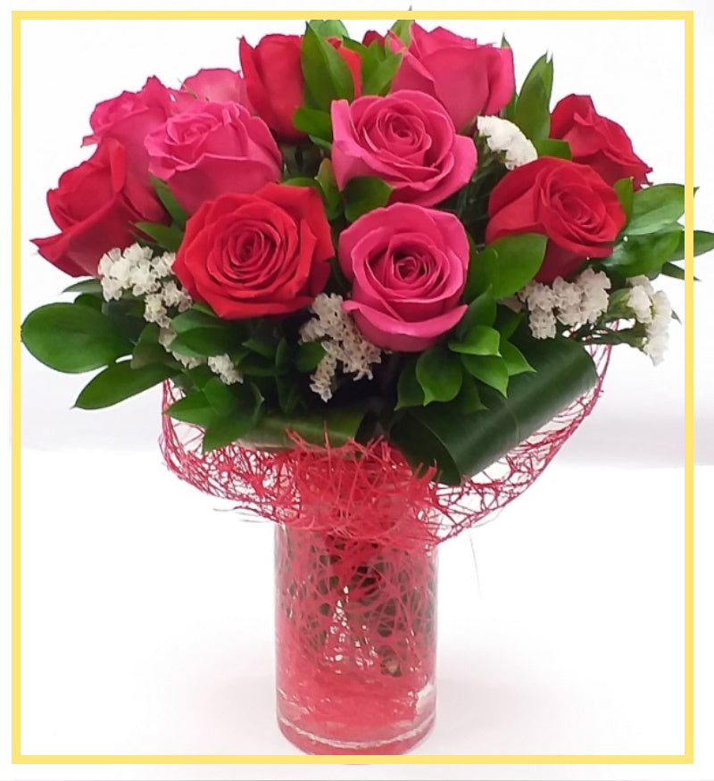In this arrangement or floral bouquet, you will find pink Roses, red Roses, white Statice, green Ruscus leaves, and Aspidistra leaves framed in a clear cylinder vase with red mesh.