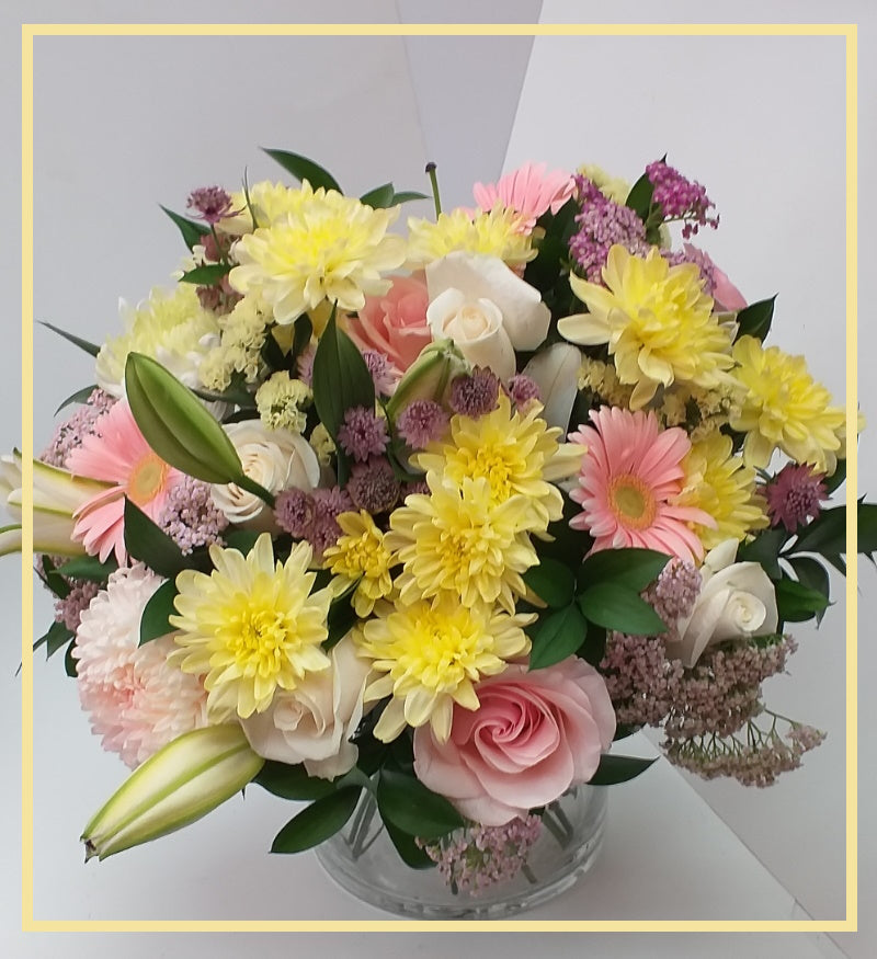 Give this wonderful collection of Blush Mums (Chrysanthemum), light pink Gerbera, yellow Mums (Chrysanthemum), white and soft pink Roses, pink Starflower, white Lilies, and pink Yarrow. Seal it with a virtual kiss, for good measure.