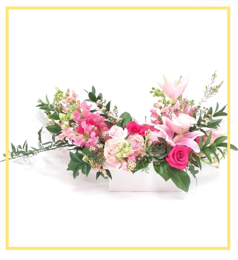 A widely sophisticated array of uniquely placed soft pink Snapdragons, soft pink Alstroemeria, hot pink Roses, soft pink Roses, pink Lilies, white Waxflower, and last but not least, Echeveria succulent in a rectangular white ceramic vase. It will definitely make her day.