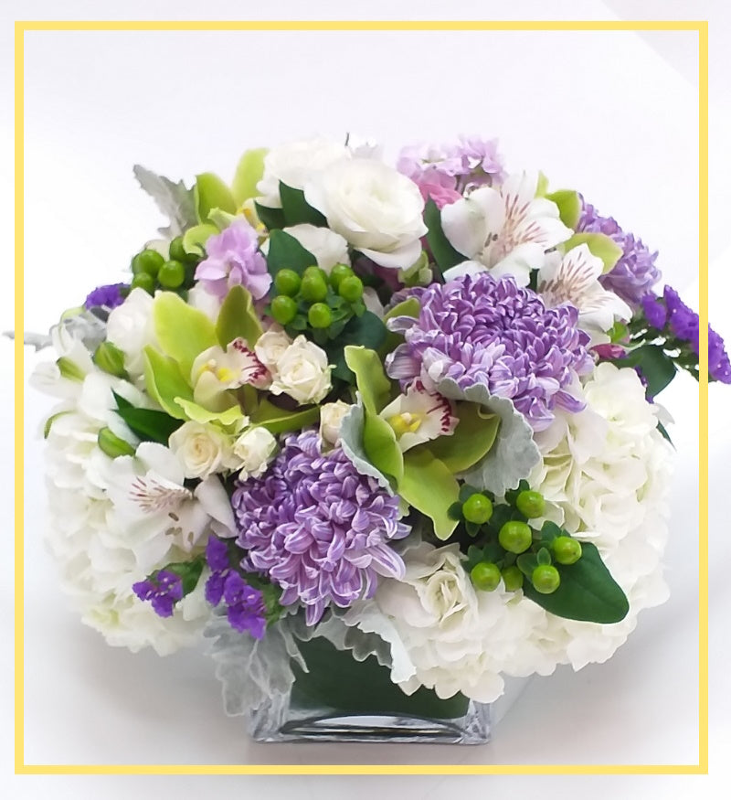 A mix of designer selected lavender Mums (Chrysanthemum), green Boat Orchids (Cymbidiums), and green Hypericums, makes for a perfect way to treat someone with royalty. White Alstroemeria are used to bring out the pops of green and purple colours, and to create a luxurious shape for any high-end birthday event.