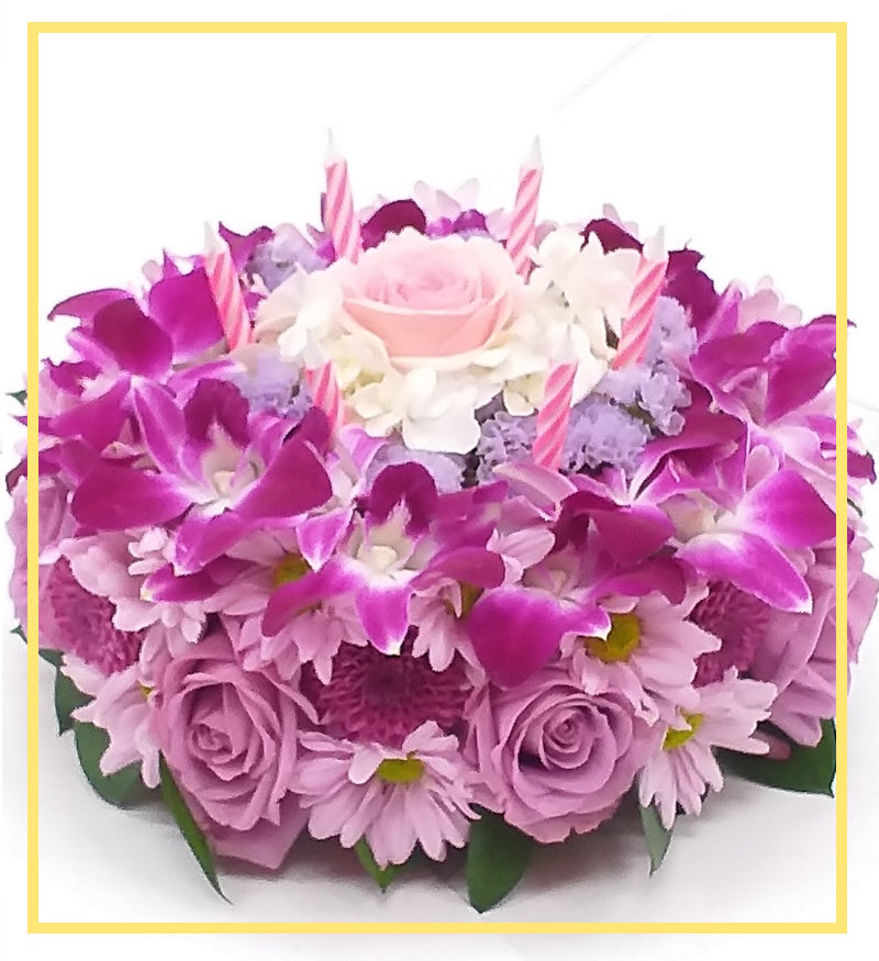 This gorgeous floral cake is expertly crafted using purple Daisies, light purple Roses, pink Dendrobium Orchids, lavender Statice, white Hydrangeas, and soft pink Roses.
