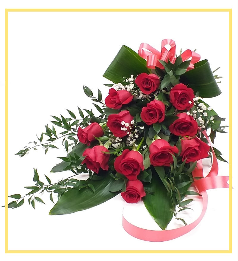 The main component are the red Roses, but the greenery is needed to complete this outstanding bouquet. You will find Baby’s Breath, Aspidistra leaves, and Italian Ruscus leaves. Completed with a beautiful red ribbon bow.