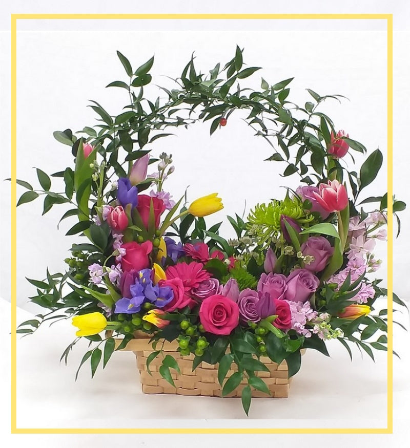 In this basket, pink and purple Roses, pink Gerbera, pink Stocks, blue Iris, green Spider Mums, green Hypericum, variety of Tulips, white Starflower, and Salal leaves (Gaultheria Shallon) is used.