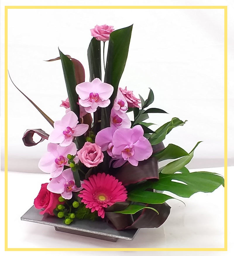 Elegant light pink Phalaenopsis orchids, pink lisanthus, green hypericum, hot pink roses, hot pink gerbera, Aspidistra leaves, Monstera leaves, burgundy Dracaena leaves, green Hypericums, and Ruscus leaves are used.