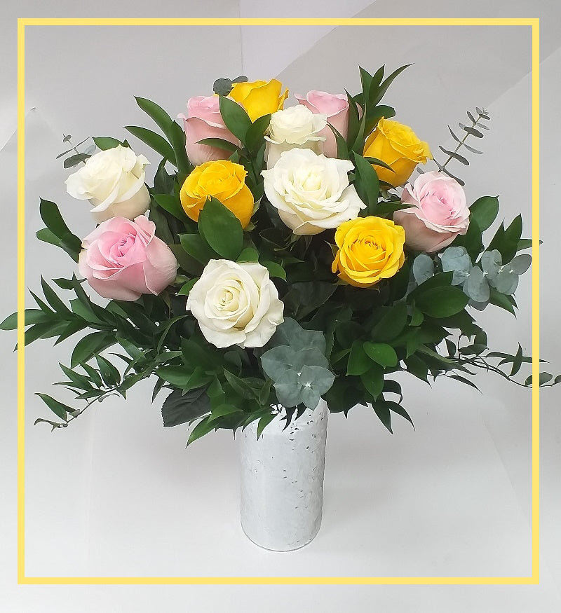 Let us take the pressure off, and make this event special with a collection of yellow, white and light pink Roses, placed in a silver modern vase. Beautifully designed and completed with scented Eucalyptus, Salute To Happiness is the perfect memorable anniversary gift.