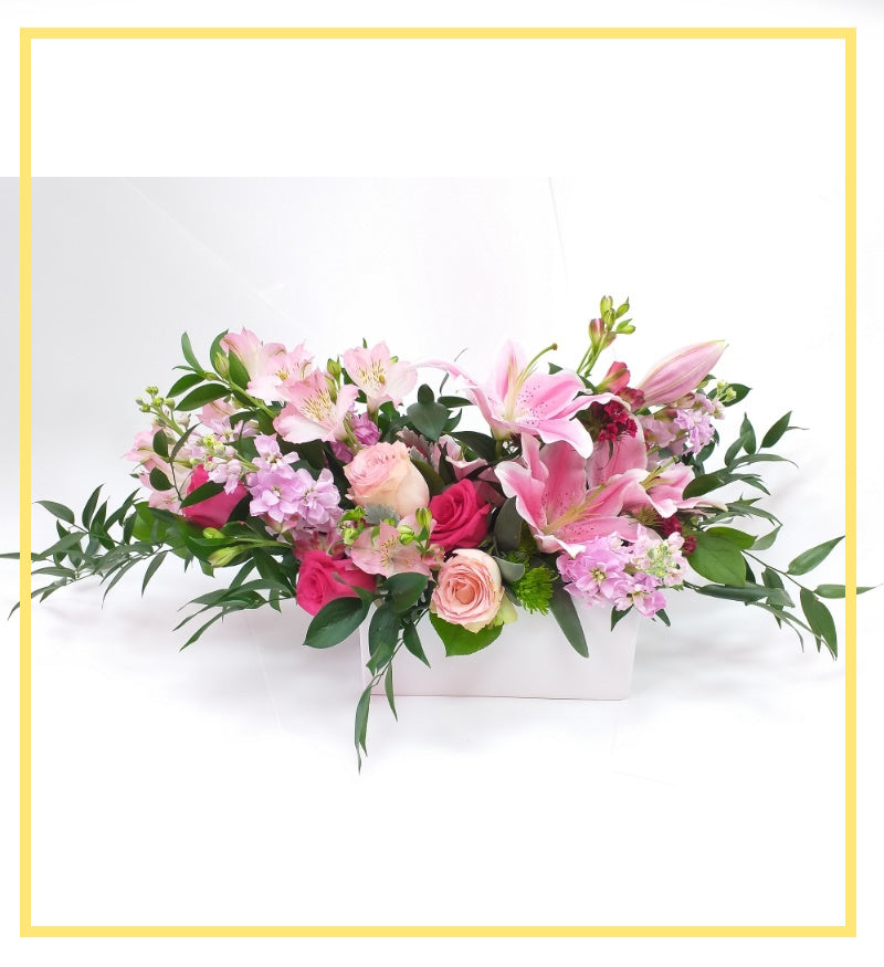 Strength and Grace is composed of pink Lilies, hot/soft pink Roses, and beautiful fragment Stocks. Topped with soft pink Alstroemeria.