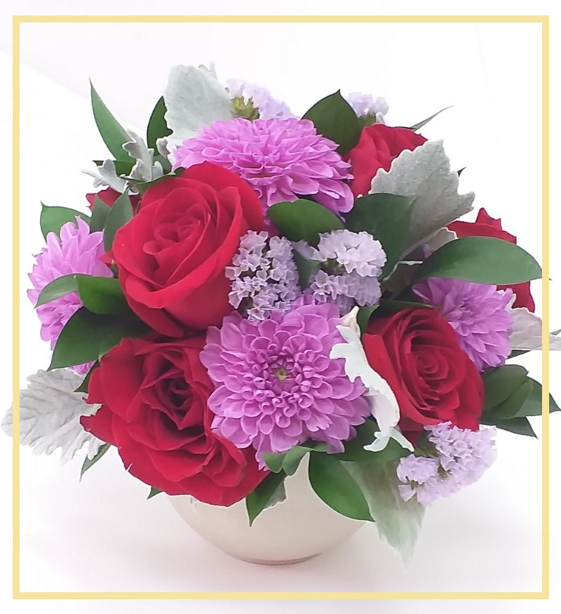 Specially handcrafted petite bouquet of red Roses, purple Dahlias, and lavender Statice creates a gorgeous array of intense reds and rays of purple blooms. Dusty miller is perfectly arranged in this bouquet to bring out those intense colours.
