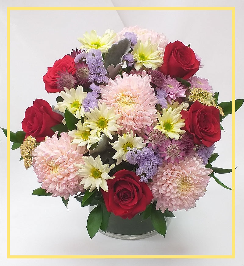Red Roses, light yellow Daisies, blush pink Mums (Chrysanthemums), yellow Yarrow, lavender Statice, and pink Starflower demonstrate that message perfectly.